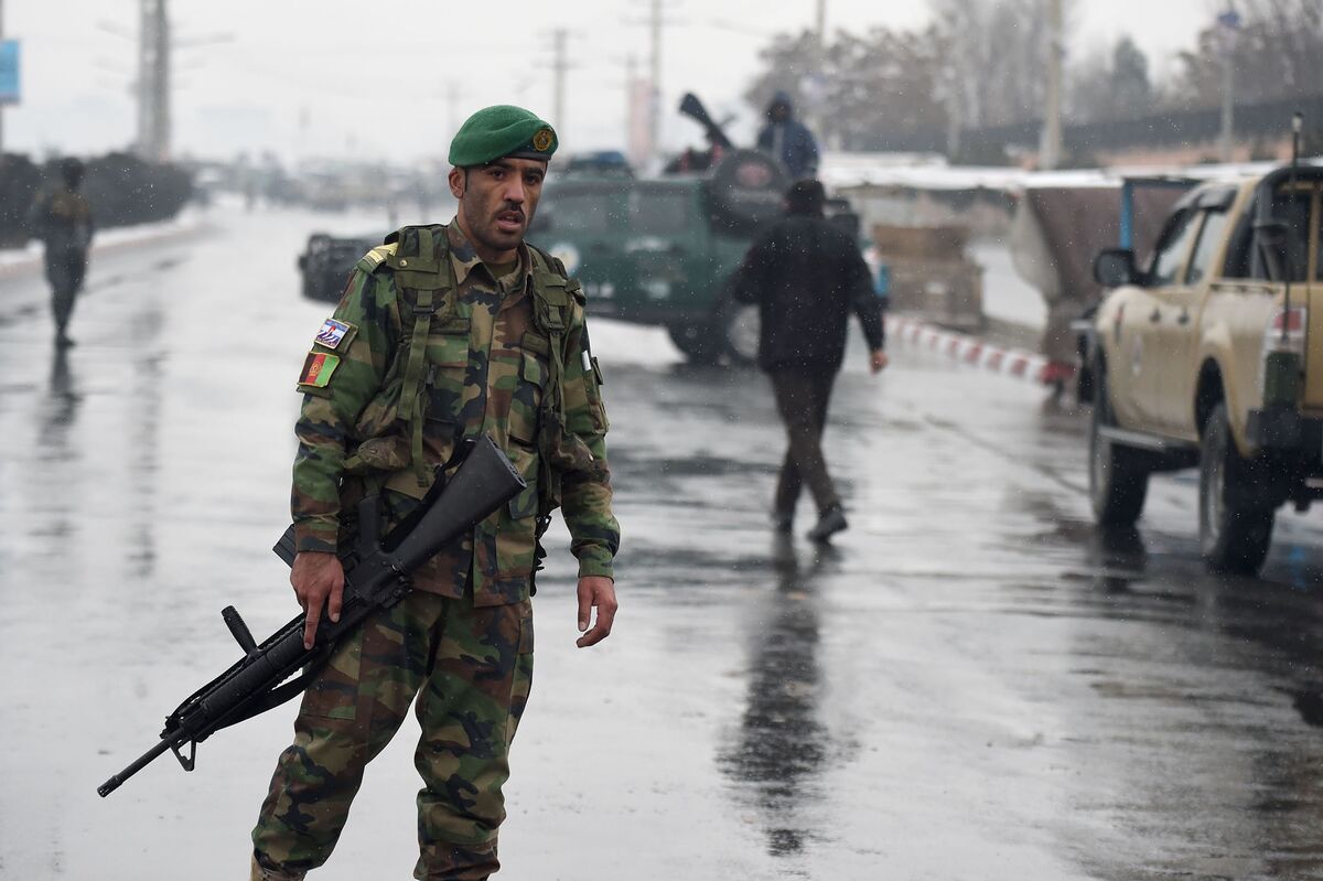 Afghan security personnel stand guard near the site of an attack near the Marshal Fahim Military Academy base in Kabul on Jan.